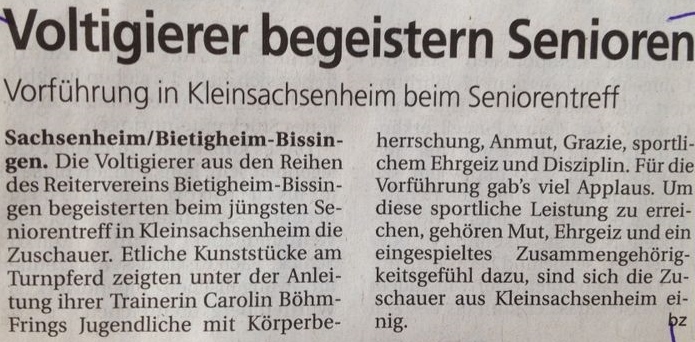 Außerdem haben wir noch einen sehr netten kleinen Zeitungsartikel über unseren Schauauftritt in der Bietigheimer Zeitung vom 20. Mai gefunden.