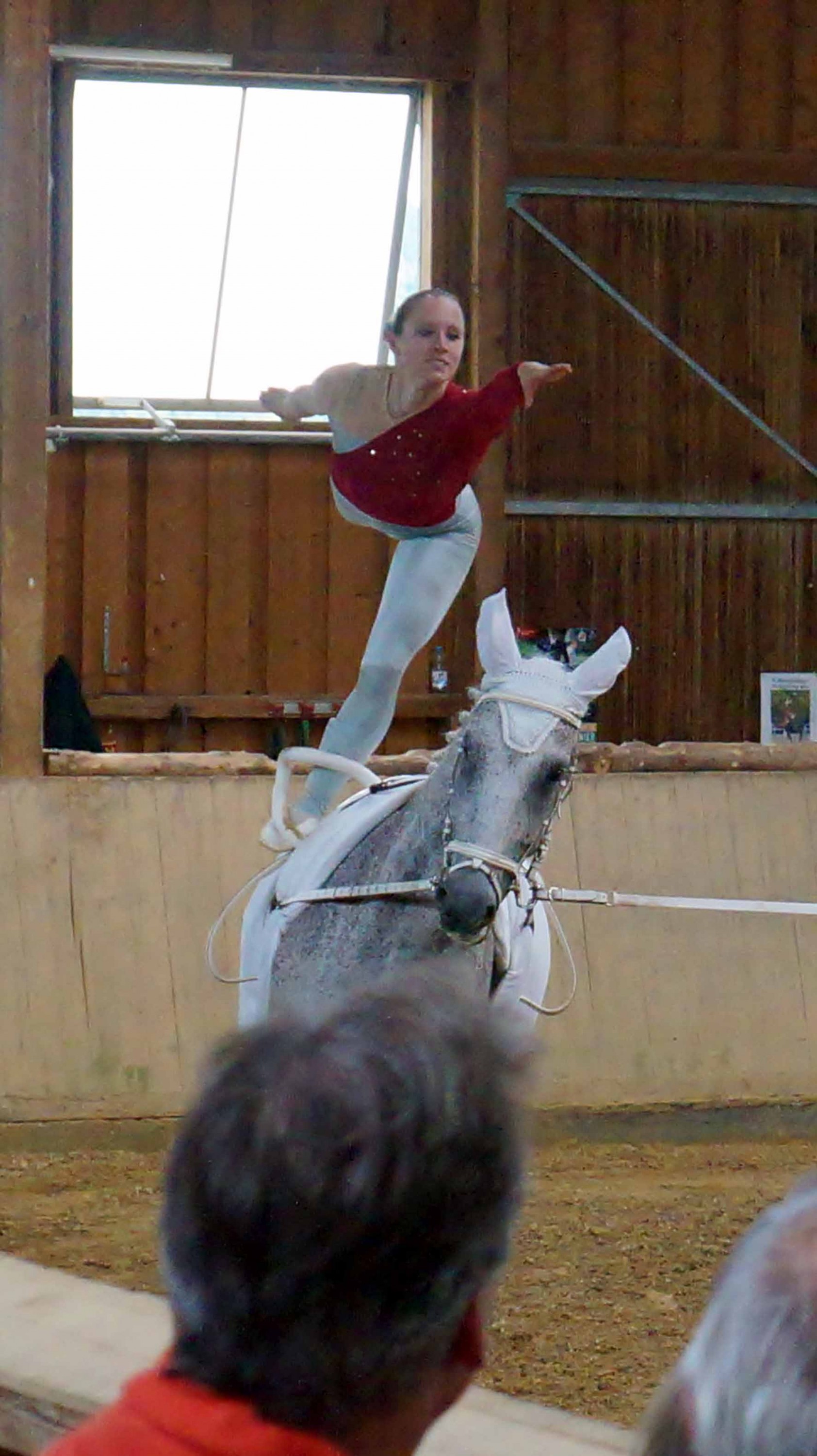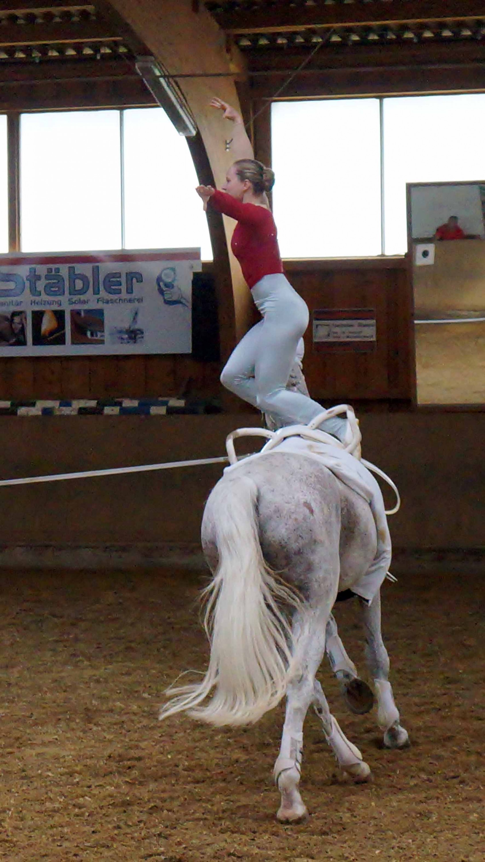 Nachmittags gings dann sofort mit unseren Einzeln weiter. Carina, Luna, Becci und Tobi starteten alle mit Romeo im M-Einzel. Romeo war leider schon in der ganzen Vorbereitung angespannt und nervös. Im Turnierzirkel ist er dann aber sehr brav durchgelaufen, auch wenn er dabei verkrampft war. Mit ein bisschen mehr Erfahrung wird er aber bestimmt auch auf den Turnieren bald die Gelöstheit zeigen können, die er im Training hat. Die Einzelstarts selber liefen ruhig und sicher durch. Carina erreicht mit einer 6,660 den 2. Platz, Luna und Tobi teilten sich mit einer 6,526 den 3. und Becci erreichte eine 6,340 und damit den 6. Platz. Luna konnte auch bei den M-Einzeln den Sonderpreis für die beste Pflicht einheimsen!
