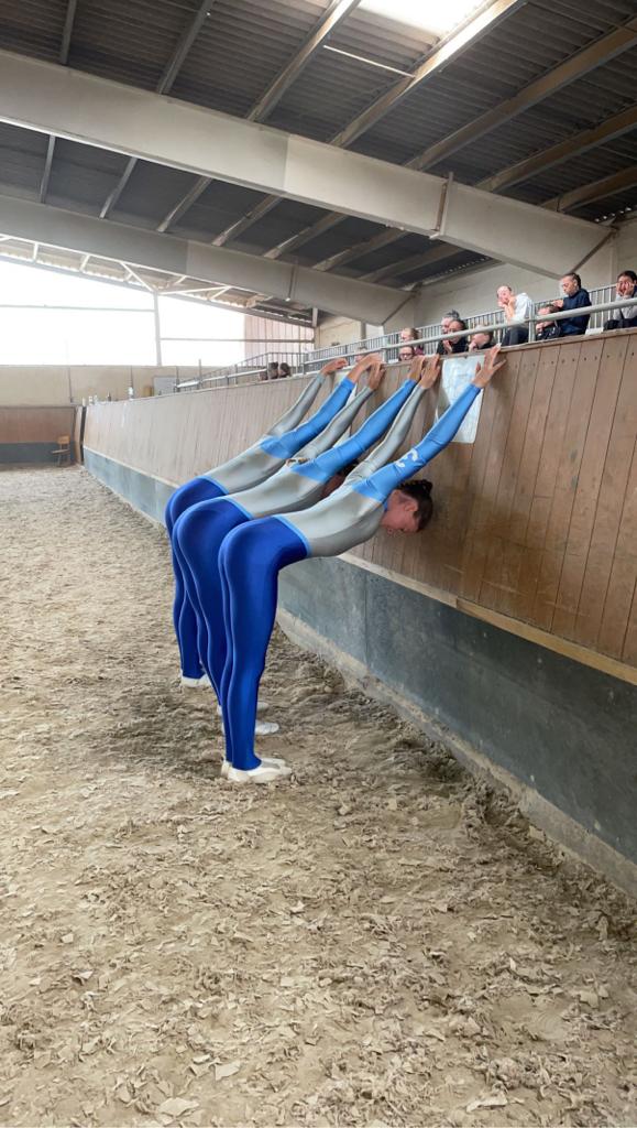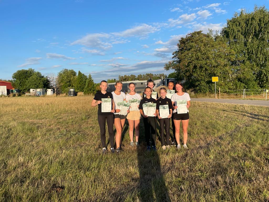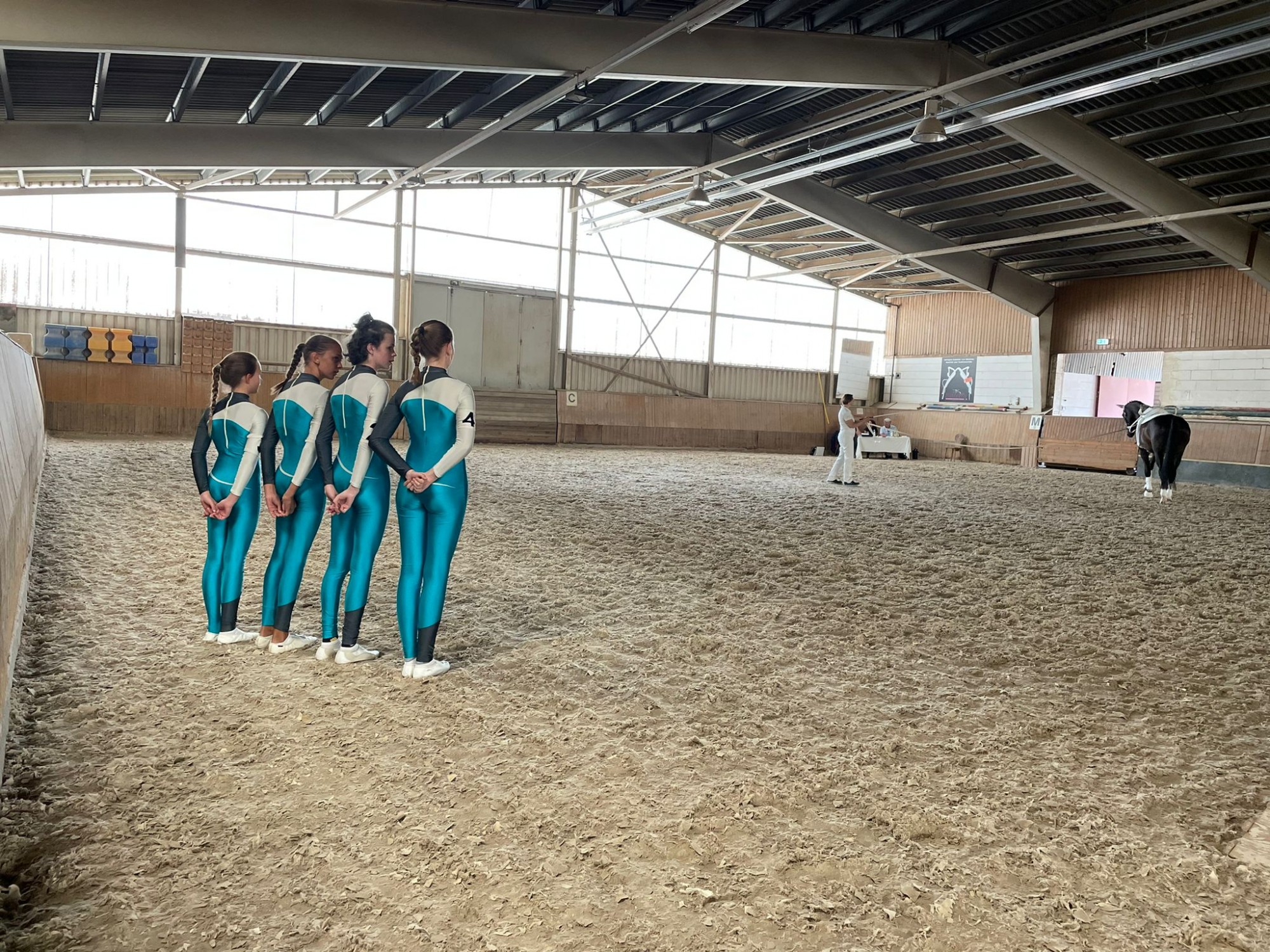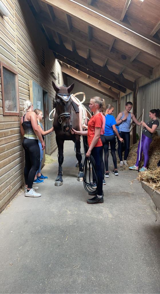 Am Montag begann dann auch schon das Training. Täglich hatten die beiden Mannschafen jeweils eine Einheit auf dem Pferd, Holzpferd und in der Turnhalle. Abends stand dann noch für die unterschiedlichen Abzeichen der Theorieunterricht auf dem Programm. Am Donnerstag stand der "Fun-Tag" an. Dieser war allerdings mit der Abnahme des Führteils und der Praxis sowie Theorie des Pferdeführerscheins und dem Longierabzeichen-Theorieunterricht gefüllt. Am Samstag wurden dann alle andere Abzeichen abgenommen. Begonnen haben die Longierabzeichen, die unsere Trainerinnen Berenike, Belinda und Amelie mit Bestnoten bestanden haben. Auch die Voltiabzeichen wurden alle erfolgreich abgelegt. Im Rahmen des Bunten Abends wurden die Urkunden an die Teilnehmer überreicht. Die Abreise am Sonntag verlief zügig, sodass wir früher als gedacht zurück waren. Dies war vor allem durch die Abreise der Pferde am Samstag möglich, den Caro wieder organisierte.