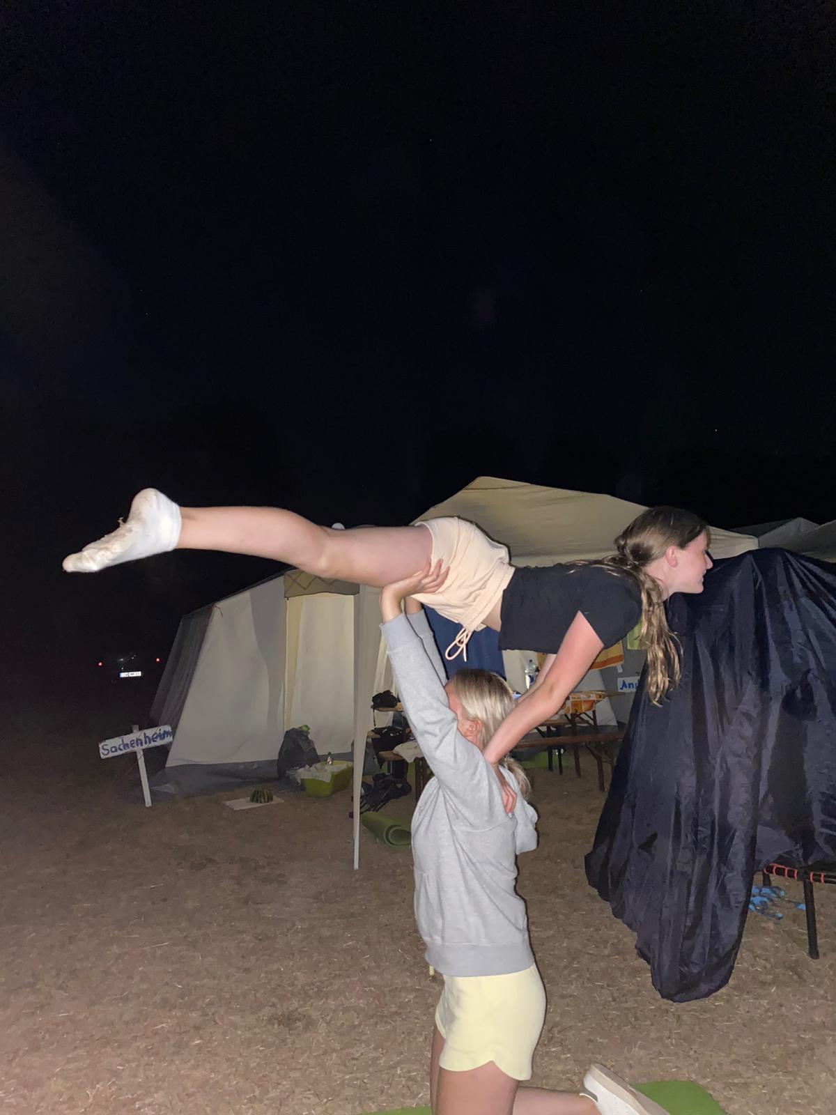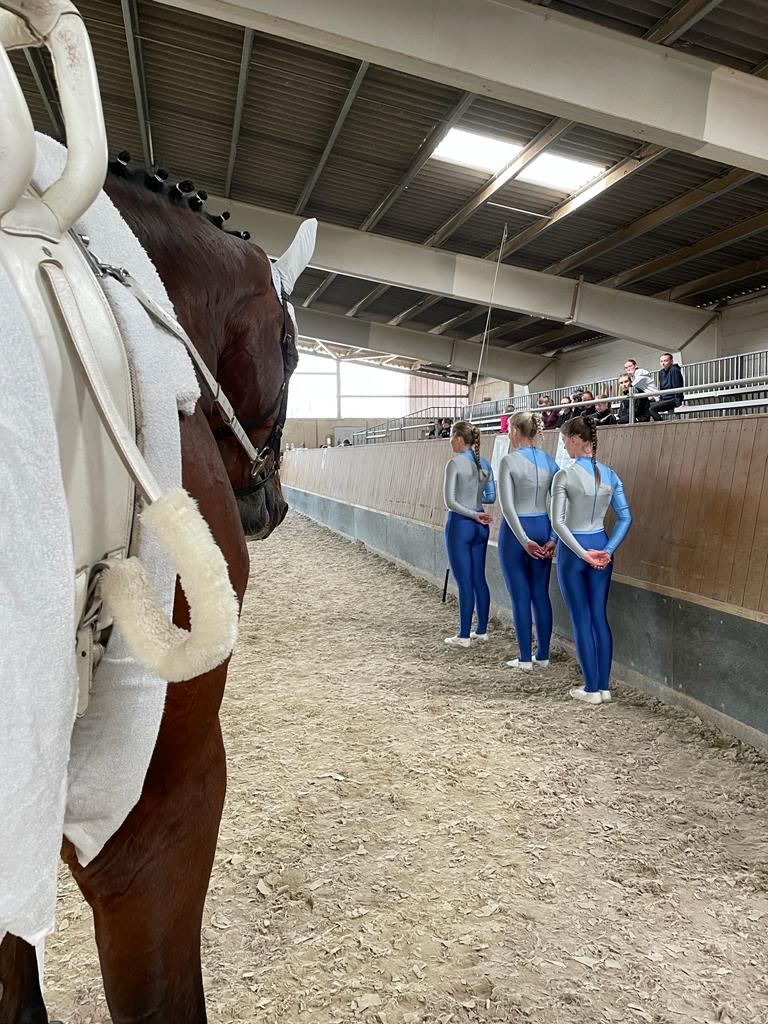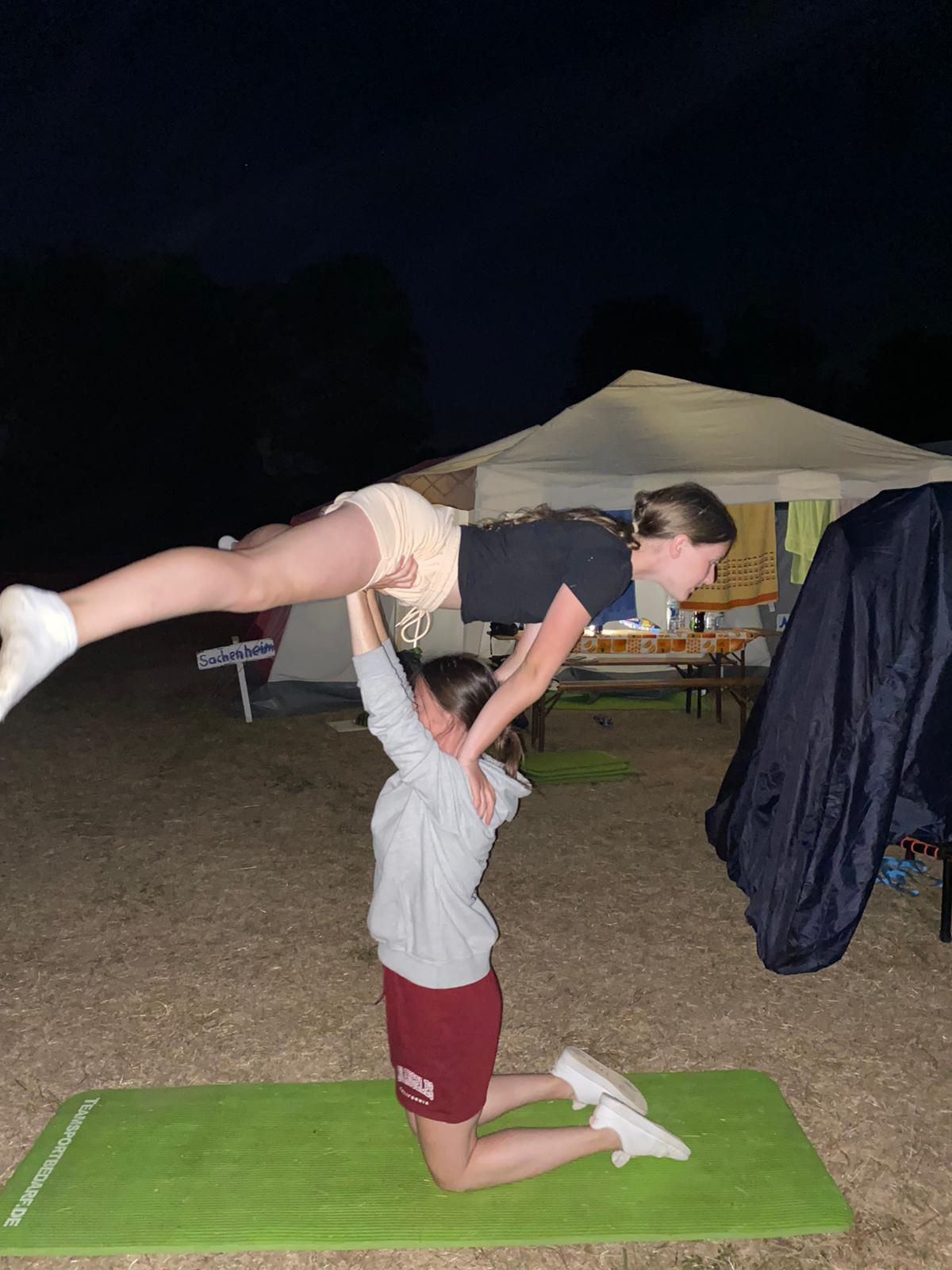 Am Montag begann dann auch schon das Training. Täglich hatten die beiden Mannschafen jeweils eine Einheit auf dem Pferd, Holzpferd und in der Turnhalle. Abends stand dann noch für die unterschiedlichen Abzeichen der Theorieunterricht auf dem Programm. Am Donnerstag stand der "Fun-Tag" an. Dieser war allerdings mit der Abnahme des Führteils und der Praxis sowie Theorie des Pferdeführerscheins und dem Longierabzeichen-Theorieunterricht gefüllt. Am Samstag wurden dann alle andere Abzeichen abgenommen. Begonnen haben die Longierabzeichen, die unsere Trainerinnen Berenike, Belinda und Amelie mit Bestnoten bestanden haben. Auch die Voltiabzeichen wurden alle erfolgreich abgelegt. Im Rahmen des Bunten Abends wurden die Urkunden an die Teilnehmer überreicht. Die Abreise am Sonntag verlief zügig, sodass wir früher als gedacht zurück waren. Dies war vor allem durch die Abreise der Pferde am Samstag möglich, den Caro wieder organisierte.