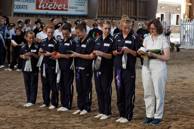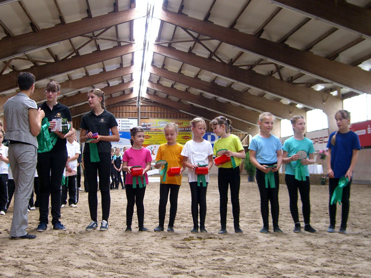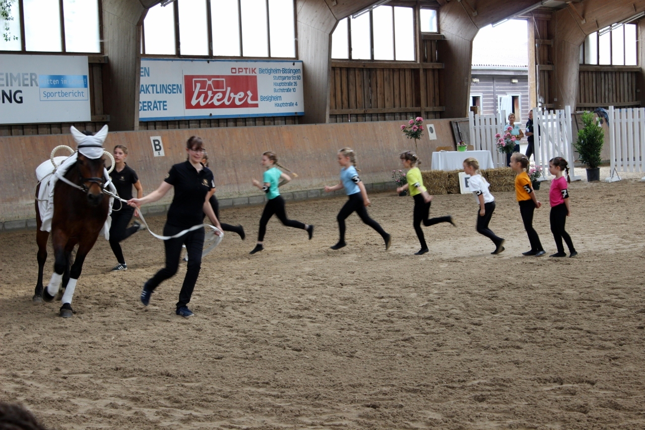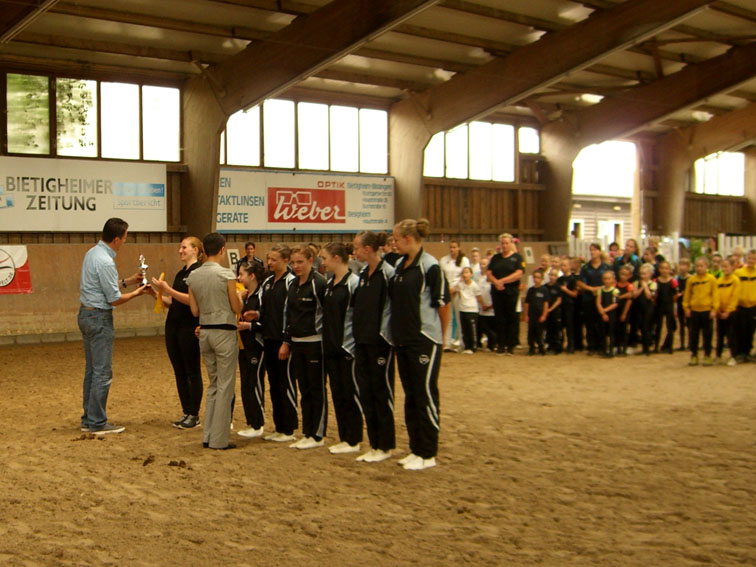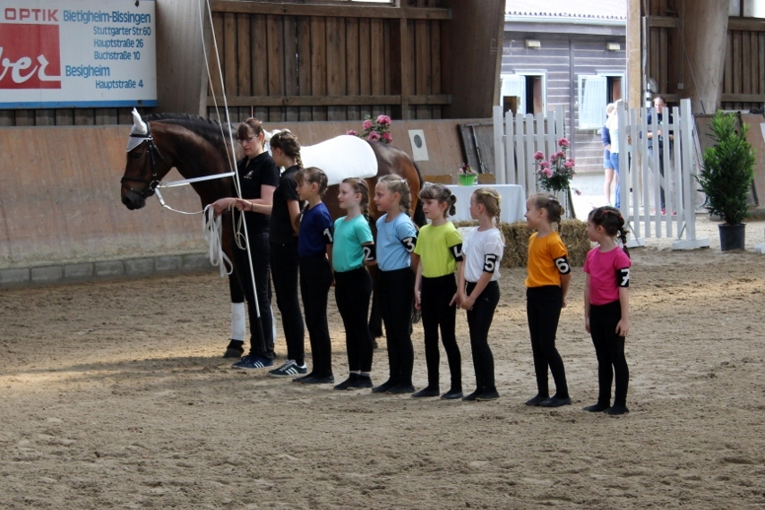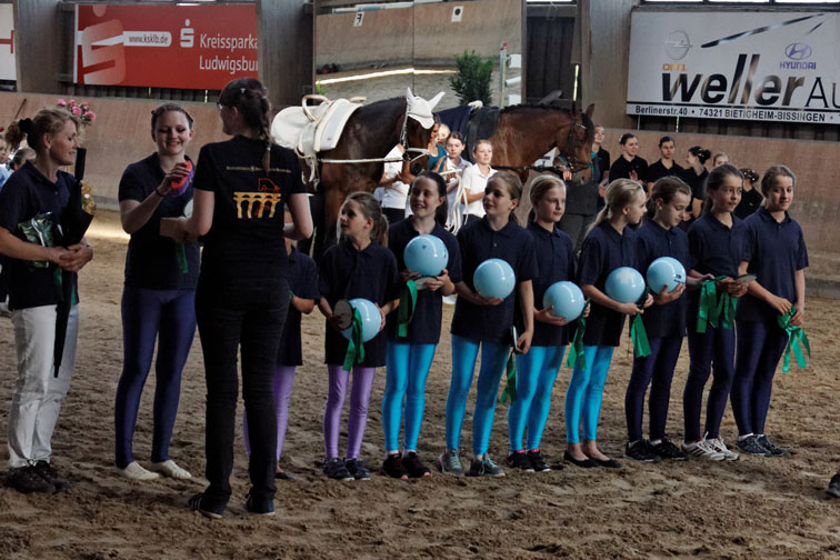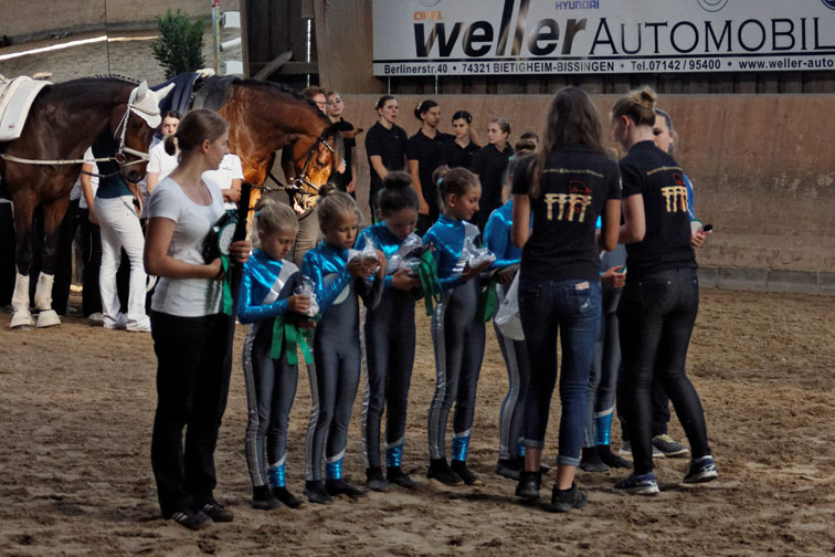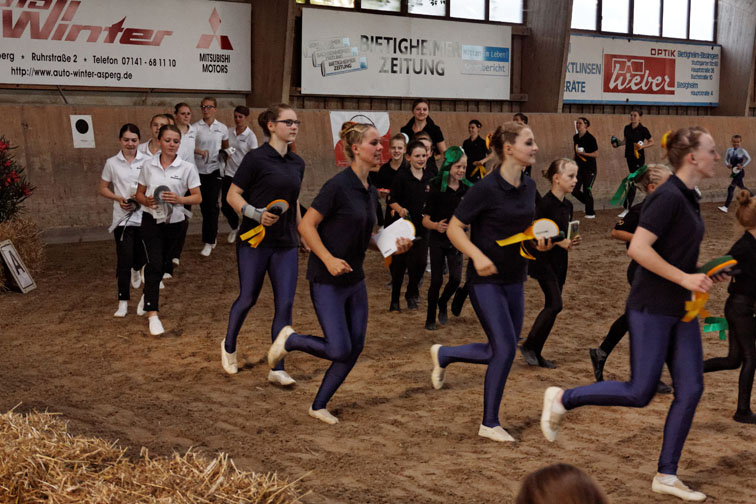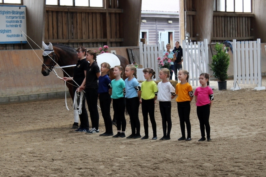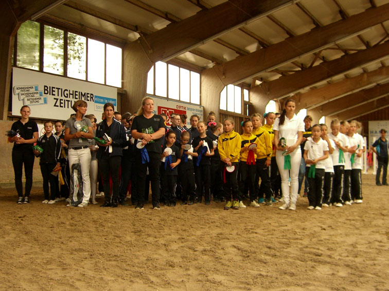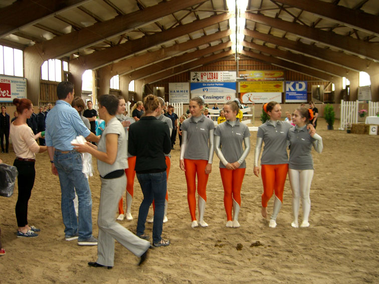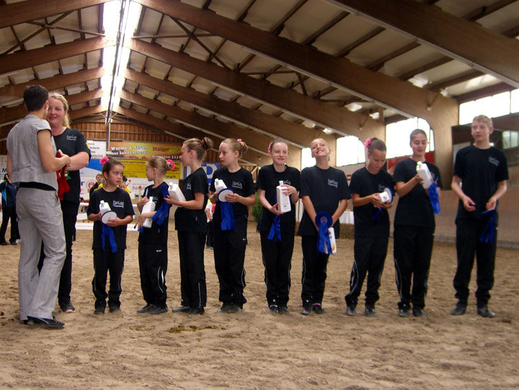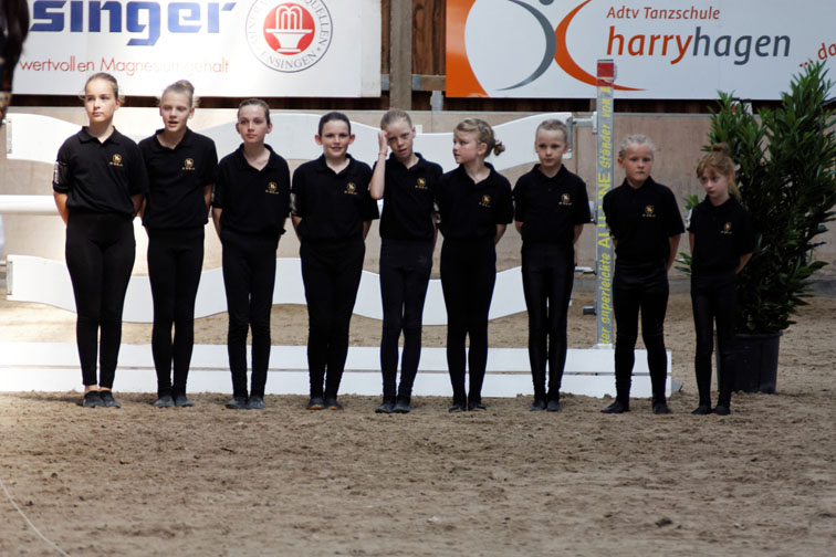Während die erste Mannschaft des Vereins leider aufgrund ihres kranken Pferdes nicht starten konnte, genossen die anderen drei Mannschaften sichtlich ihren Start vor heimischer Kulisse. Die zweite Mannschaft (Klasse L) erreichte mit ganz vielen neuen Gesichtern in dieser Saison eine 5,1 (Platz 7), die dritte Mannschaft (Galopp/Schritt) eine 4,3 (Platz 4) und die vierte Mannschaft (Schritt/Schritt) eine 4,1 (Platz 3). Für viele Sportler war es der erste Turnierstart, den sie gleich toll gemeistert haben.