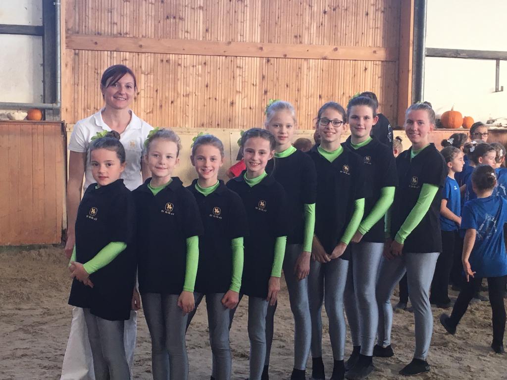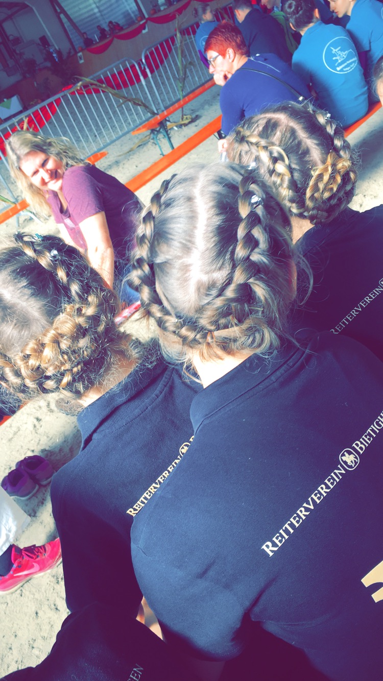 Am Samstag traf sich das L-Team um 7 Uhr im Stall um alles fertig für die Abfahrt zu machen. Leider konnte Charlotte auf Grund einer starken Erkältung dieses Turnier nicht mitstarten, um aber auf sie nicht komplett verzichten zu müssen sprang Netti kurzfristig für sie ein. Erst am Freitag davor stand dies fest, worauf sie spontan noch in die Kür eingebaut wurde. Sie flochten sich die Haare und auch Romeo bekam seine Turnierfrisur verpasst. An ihm musste außerdem der Dreck noch ordentlich abgeschrubbt werden, halt ein Nachteil eines Schimmels. Doch auch das hatte das Team gemeinsam Ruck Zuck erledigt, vor allem da sie Sarah als Unterstützung begleitete. Um 8:15 konnte die Kolonne aus Hänger uns Auto voller Voltis den Hof verlassen. Nur eine halbe Stunde später waren sie schon in Ilsfeld angekommen. Die Pflicht startete um 10 Uhr. Davor wurde alles routinemäßig vorbereitet und auch das warm machen wurde nicht ausgelassen. Mit der Kür waren sie alle sehr zufrieden. Exakt eine Stunde später stand das Team erneut im Turnierzirkel um ihre Kür zu präsentieren. Das Team war leider - auf Grund ein paar Patzern - nicht zu 100% zufrieden mit sich. Eigentlich konnten sie aber stolz auf sich sein, da es wirklich nur kleine Wackler waren. Direkt im Anschluss war die Siegerehrung der L- und M-Teams. Mit einer 5,627 konnte sich das Team den 4. Platz erkämpfen. Wir sind stolz auf euch.
