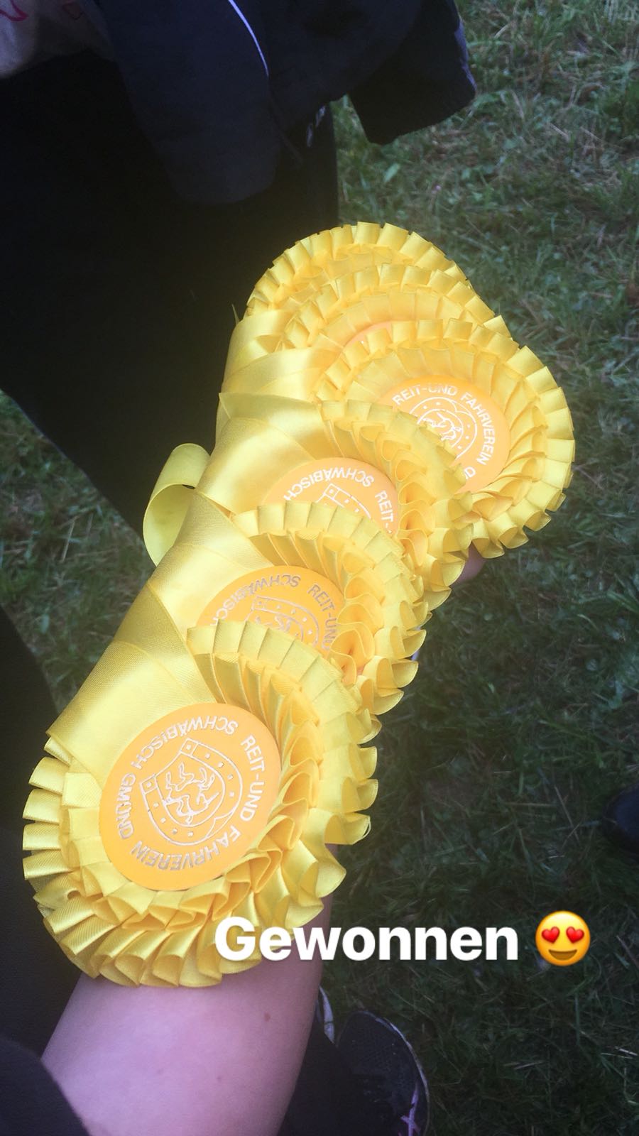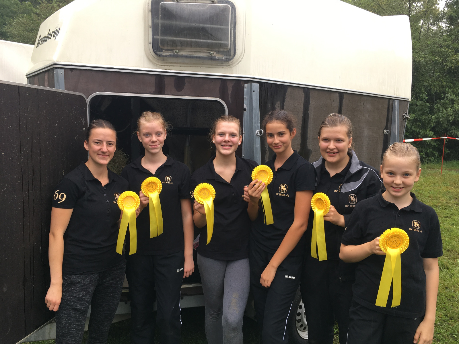 An diesem Turniertag ging es für das L-Team schon sehr früh los, denn sie trafen sich schon um 5:00 Uhr im Stall. Gegenseitig machten sie sich die Haare und zöpfelten Romeo ein. Die Turniertasche lag schon gepackt im Hänger. Als alles erledigt war, ging es ans Verladen, was bei Romeo keine Schwierigkeiten verursachte. Um 6:30 Uhr verließ die Truppe dann den Stall in Bietigheim.