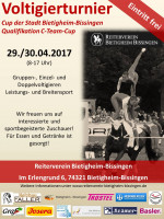Wir freuen uns sehr, Euch zusammen zu unserem 3. Voltigierturnier, dem Cup der Stadt Bietigheim-Bissingen und der Qualifikation für den C-Team-Cup, begrüßen zu dürfen. Wir bedanken uns für Eure Nennungen, hoffen auf zwei spannende Turniertage und wünschen allen Aktiven, Richtern, Sponsoren und Zuschauern eine gute Anreise und erfolgreiche Prüfungen. Wir freuen uns auf euch!
