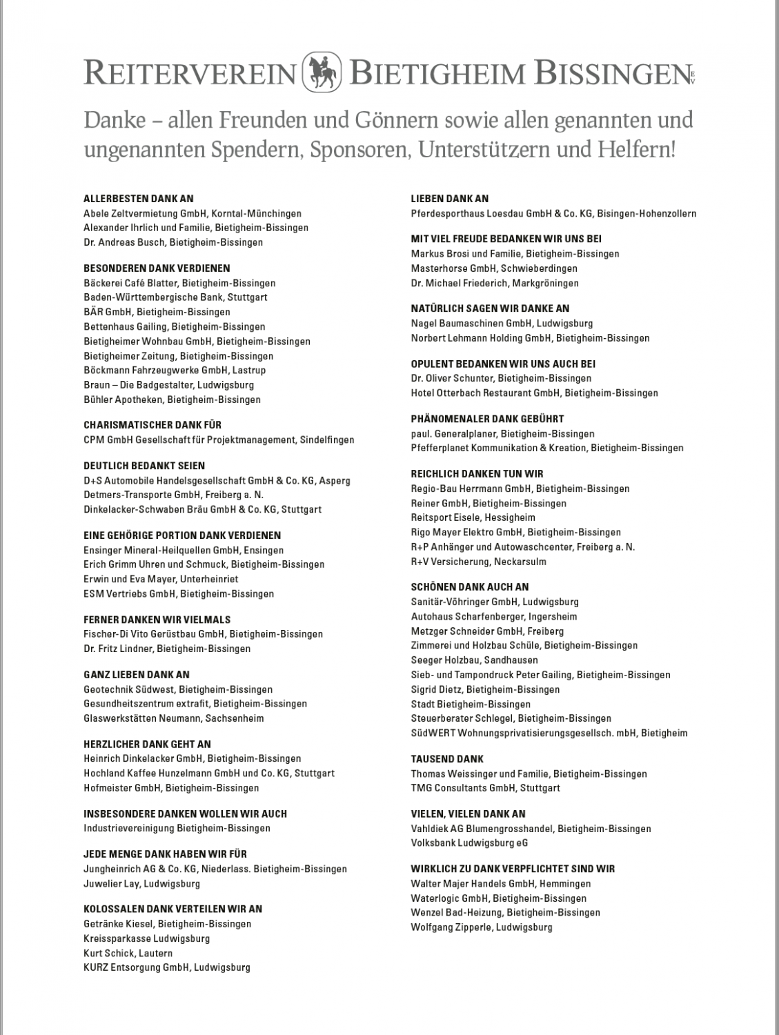 Der Vorstand und die Turnierleitung des Reiterverein Bietigheim-Bissingen e.V. danken sehr herzlich der Stadt Bietigheim-Bissingen für die Unterstützung und traditionell sehr gute Zusammenarbeit vor und während der Veranstaltung und bei der Bewältigung der vielen Herausforderungen, die dieses große Turnier an den Reiterverein stellt.