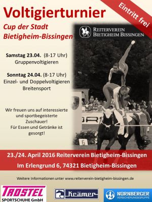 Aufgrund der guten Ressonanz des letzten Jahres haben wir die Herausforderung angenommen und richten auch 2016 wieder ein Voltigierturnier aus. Am 23. und 24. April haben damit auch die Akrobaten unter den Pferdesportlern die Möglichkeit sich auf unserer Anlage zu präsentieren. Wir freuen uns schon jetzt auf ein schönes Turnierwochenende voller spannender Wettkämpfe!