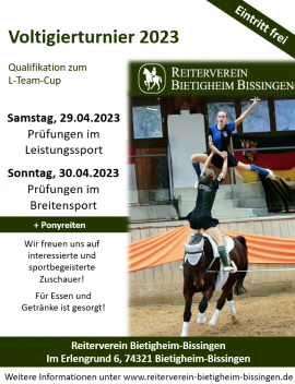 Am 29. & 30. April richten wir unser 6. Voltigierturnier aus. Damit haben auch die Akrobaten unter den Pferdesportlern die Möglichkeit, sich auf unserer Anlage zu präsentieren. Ein besonderes Highlight ist die Qualifikation für den L-Team-Cup. Momentan sind wir aber noch in der Planung. Bald finden Sie hier auch schon die Ausschreibung und später auch die Zeiteinteilung. Wir freuen uns schon jetzt auf ein schönes Turnierwochenende, mit allen LPO Prüfungen am Samstag und den Prüfungen aus dem WBO Bereich am Sonntag.