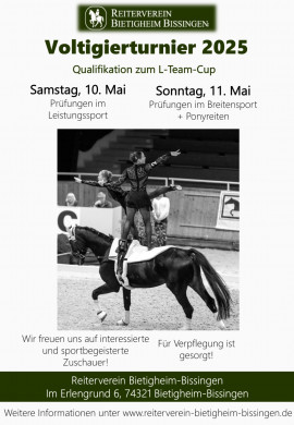 Am 10. & 11. Mai richten wir unser 8. Voltigierturnier aus. Damit haben auch die Akrobaten unter den Pferdesportlern die Möglichkeit, sich auf unserer Anlage zu präsentieren. Ein besonderes Highlight ist die Qualifikation für den Deutschen Voltigierpokal der L-Gruppen, den wiederholt der Bietigheimer Reiterverein austragen darf. Momentan sind wir aber noch in der Planung. Bald finden Sie hier auch schon die Ausschreibung und später auch die Zeiteinteilung. Wir freuen uns schon jetzt auf ein schönes Turnierwochenende, mit allen LPO Prüfungen am Samstag und den Prüfungen aus dem WBO Bereich am Sonntag.