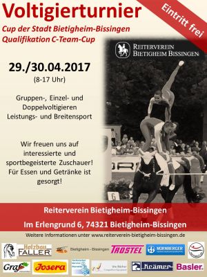 Auch 2017 richten wir wieder ein Voltigierturnier aus. Am 29. und 30. April haben damit auch die Akrobaten unter den Pferdesportlern die Möglichkeit sich auf unserer Anlage zu präsentieren. Ein besonderes Highlight ist neben dem Cup der Stadt Bietigheim-Bissingen, der im M-Gruppenvoltigieren ausgetragen wird, dieses Mal auch die Qualifikation für den C-Team-Cup, den nationalen Vergleich der L-Teams. Wir freuen uns schon jetzt auf ein schönes Turnierwochenende voller spannender Wettkämpfe im Breiten- und Leistungssport!