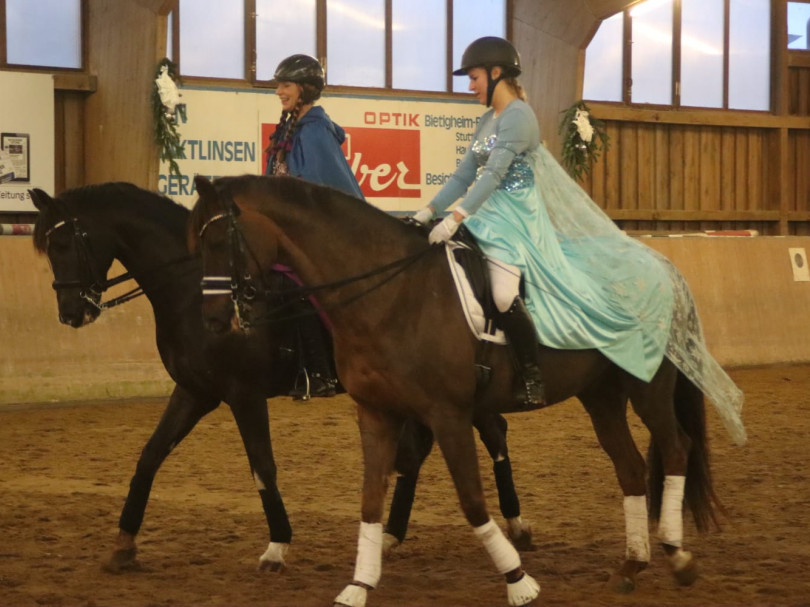 Vorab wurde von den vielen aktiven Vereinmitgliedern Dekorationen gebastelt, Kostüme geschneidert und jede Menge Probestunden geleistet. Die Kinder vom eigenen Ponyclub zeigten eine Ponyquadrille in tollen „Schneemann-Olaf“ Kostümen, die Voltegierer bezauberten mit einer Kür und viele andere Schauspieler, Reiter und natürlich die Pferde stellten wundervolle Szenen dar.