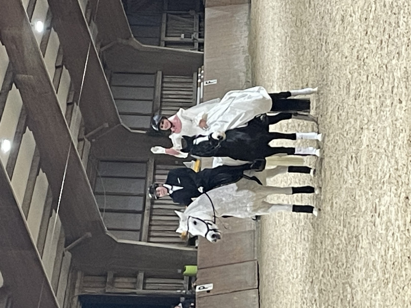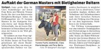 Gestern Abend wurden die 37. German Masters in der Stuttgarter Schleyerhalle mit einem bunten Rahmenprogramm offiziell eröffnet. Noch bis Sonntag trifft sich die internationale Reitelite in der Landeshauptstadt. Als absolutes Highlight für den Reiterverein Bietigheim-Bissingen waren auch drei Vereinsmitglieder am Start im Hallenensemble aus Schleyerhalle und Porschearena. Yvonne Fuchs (Führerin), Clara Stammberger (Reiterin) und Pony Berta nahmen an einer Pony-Agility-Prüfung mit Erfolg teil. Hierbei bildete immer ein Pony-Team gemeinsam mit einem Hunde-Agilty-Paar, aus der Weltspitze des Hundesports, ein Team und es musste ein anspruchsvoller Parcours vor tausenden Zuschauern in möglichst kurzer Zeit gemeistert werden. Unter tosendem Applaus drehten alle Teilnehmer und Teilnehmerinnen samt ihren tierischen Partnern nach der Prüfung eine Ehrenrunde vor dem begeisterten Publikum in der Schleyerhalle. Der gestrigen Prüfung vorausgegangen war eine intensive Trainigsphase mit Probetrainings in Herrenberg und Jettingen. Insgesamt starteten zehn Teams aus Baden-Württemberg.