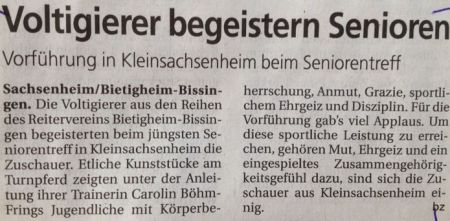 Am 07.05.2014 waren wir als Schaueinlage auf dem Kleinsachsenheimer Seniorentreff. Unter dem Motto Schwanensee/Black Swan haben wir uns sehr gefreut dort eine Mischung aus Akrobatik und Voltigieren auf dem Turnpferd zeigen zu dürfen. Wir hoffen, es hat allen gefallen und möchten uns ganz herzlich für die vielen netten Rückmeldungen aus dem Publikum bedanken!