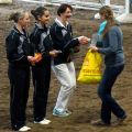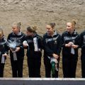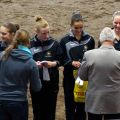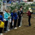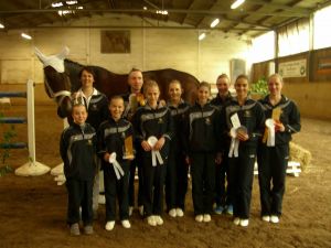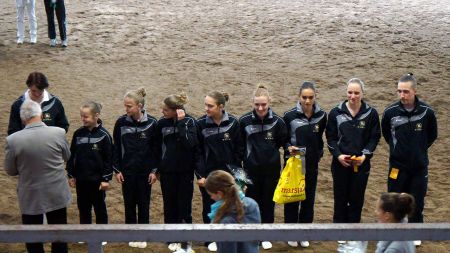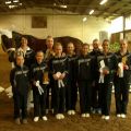 Dann hieß es schnell alle zusammen anpacken, denn die Pferde mussten getauscht werden. Kurze Zeit später ging es nämlich für das M-Team auf Carneol weiter. Die Pflicht lief ordentlich durch und wir waren dann ziemlich erleichtert, dass sich das Steh-Dilemma von letzter Woche nicht wiederholt hat. Dann gings als nächstes mit der Kür weiter - und zwar mit ziemlich gemischten Gefühlen. Verenas Verletzung vor zwei Wochen und der dadurch bedingte Kürumbau hat uns doch etwas ins Trudeln gebracht und einigermaßen turnierreif lief die Kür auch erst im letzten Training durch... Mit den ersten gelungenen Übungen stieg dann während der Prüfung aber die Zuversicht und Sicherheit und wir konnten uns über unseren Kürdurchlauf richtig freuen! So gut lief es vorher noch nie! Mit einer sehr guten 6,0 kamen wir hinter Ilsfeld (6,3) und Mühlacker (6,1) auf den dritten Platz!