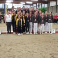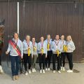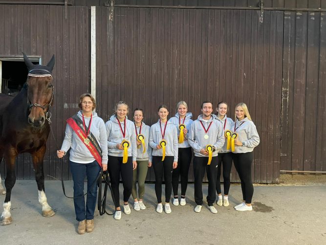 Am Abend durfte das M-Team nochmal antreten. Unter nicht ganz einfachen Bedingungen starteten sie auf einem etwas verspannten Hagrid. Voltis, Longenführerin und Pferd holten nach einem langen Wochenende noch einmal alles aus sich raus und kämpften sich durch die Kür. In der Siegerehrung erreichten sie dann für die Kür im 2. Durchlauf eine Wertnote von 6,680 und damit den 3. Platz. Dann kam die Meisterschaftsehrung und es war spanend für die drei M-Teams, da keines wusste, wer welchen Platz final belegte. Das M-Team aus Bietigheim siegte ganz knapp und holte sich den Titel "Württembergischer Meister 2022". Eine Endergebnis von 6,2. Ihr seid echt spitze! Damit habt ihr euch den Start beim Deutschen Voltigierpokal der M-Gruppen in Schwaiganger wirklich noch einmal verdient.