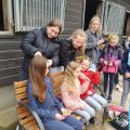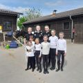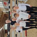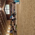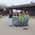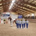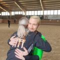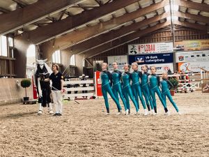 In der Mittagspause mussten sich nun auch die Nachwuchs- und Fördergruppe auf ihren allerersten Start vorbereiten. Die Nervosität der Kleinen wuchs mit Näherrücken ihrer Startzeit. Ebenso wie am Vortag, war auch an diesem Nachmittag die Reithalle gut besucht. Den Anfang nach der Mittagspause machte die Nachwuchsgruppe mit ihrer Kostümkür zu "die Schule der magischen Tiere". Jedes Kind war als ein Tier verkleidet und auch Chiara und Julia traten als Tierfängerin und Lehrerin auf. Sogar Tarina bekam etwas Schmuck in Mähne und Schweif. Direkt danach durfte die Fördergruppe den Galopp-Schritt Wettbewerb eröffnen. Sie zeigten ihre Pflicht im Galopp auf Romeo und ihre Kür im Schritt. Es verlief alles ohne große Patzer. Die vier Trainerinnen, die mit den Kleinen in den Zirkel gingen, können echt stolz auf ihre Voltis sein und haben nun auch ihr erstes Turnier als Trainerinnen hinter sich. Danach ging es schon wieder für das M-Team los. Sie zeigten noch, in Konkurrenz zu drei anderen Teams, ihre Harry Potter Kür auf dem Turnpferd. Auch mit dieser Leistung waren sie sehr zufrieden. Nun stand die letzte Siegerehrung des Turniers auf dem Programm. Die Nachwuchsgruppe erreichte den 1. Platz mit einer Wertnote von 5,590. Die Fördergruppe erhielt eine weiße Schleife für den 3. Platz mit einer Wertnote von 4,229, ebenso wie das M-Team für ihre Kür mit einer 7,4. Nach der Siegerehrung musste die Reithalle wieder leergeräumt werden. Danach konnten wir noch den Mittag und das Turnier in Sonnenschein auf der Anlage ausklingen lassen.