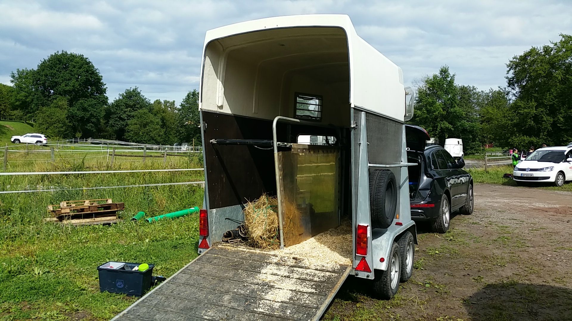 Sonntag früh traf sich das M-Team bei Regen im Stall um auch in Böblingen an den Start zu gehen. Das fleißige Verladetraining mit Carni hat Früchte gezeigt, sodass er wie früher prompt im Hänger stand und wir dadurch früher als geplant unseren Zielort erreichten. Wenn man uns kennt weiß man, was mir mit unvermutet übrig gebliebener Zeit anfangen... Richtig, essen ;) Aber nur eine Kleinigkeit, uns stand ja noch ein Start bevor. Zum Glück hatte es aufgehört zu regnen.