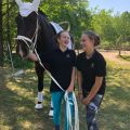 Auch Carni wurde auf sein erstes Turnier vorbereitet: geputzt, bandagiert, gegurtet und natürlich auch warm geführt. Jetzt waren auch die Voltis dran sich warm zu machen und sich mental auf ihr erstes Turnier vorzubereiten. Mal wieder war es ziemlich knapp und deshalb gab es nur eine kurze Einvoltigierrunde.