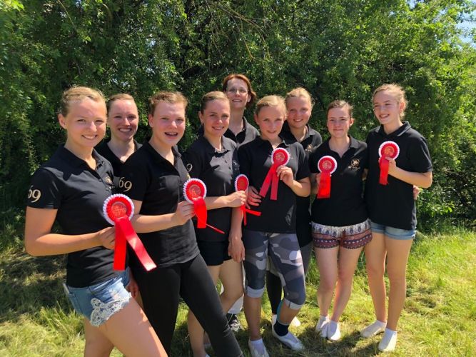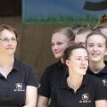 Am Sonntag fuhr auch das L-Team nach Leonberg. Dort wollten sie den Richtern das erste Mal ihre Kür präsentieren. Auch sie hatten am Freitag alles gepackt, sodass sie sich erst um 7:00Uhr treffen konnten. Sie mussten sich aber gegenseitig noch Frisuren machen und auch Romeo bekam seine Turnierfrisur. Außerdem kontrollierten sie nochmal alles auf Vollständigkeit. Leider konnten Amelie L., Sina und Chralotte nicht mitstarten. Um 8:00 Uhr verließ das Gespann dann den Hof um rechtzeitig dort zu sein. Nach einer halben Stunde erreichten sie auch schon den Hof in Leonberg. Auch an diesem Tag war das Wetter sehr warm und sonnig. Im Ablongierzirkel lief alles nach Plan. Um 10:00 Uhr betraten sie das erste mal den Turnierzirkel und zeigten eine recht gute Pflicht. Leider musste Lotta aus dem Stehen runterspringen und auch sonst waren einige Patzer. Auch Romeo war nicht in seiner besten Verfassung, doch zwischen der Kür waren es 2 Stunden in der sich Romeo ausruhen konnte. Auch das Team erholte sich und der Fresskorb durfte natürlich nicht fehlen. Die Kür lief leider etwas zäher. Romeo ist mehrmals ausgefallen und gebuckelt hat er auch noch dazu. Nach der Kür zogen sie sich nur schnell ihre Jogginganzüge über und dann mussten sie auch schon zur Siegerehrung in den Zirkel. Sie waren mit sich nicht ganz so zufrieden und erhielten den 7. Platz mit einer Wertnote von 5,144. Um 14:00 Uhr fuhren sie dann auch schon nach Hause, nachdem sie Romeo verladen hatten. Zwei Stunden später hatten sie alles verstaut und den Hänger ausgespritzt.