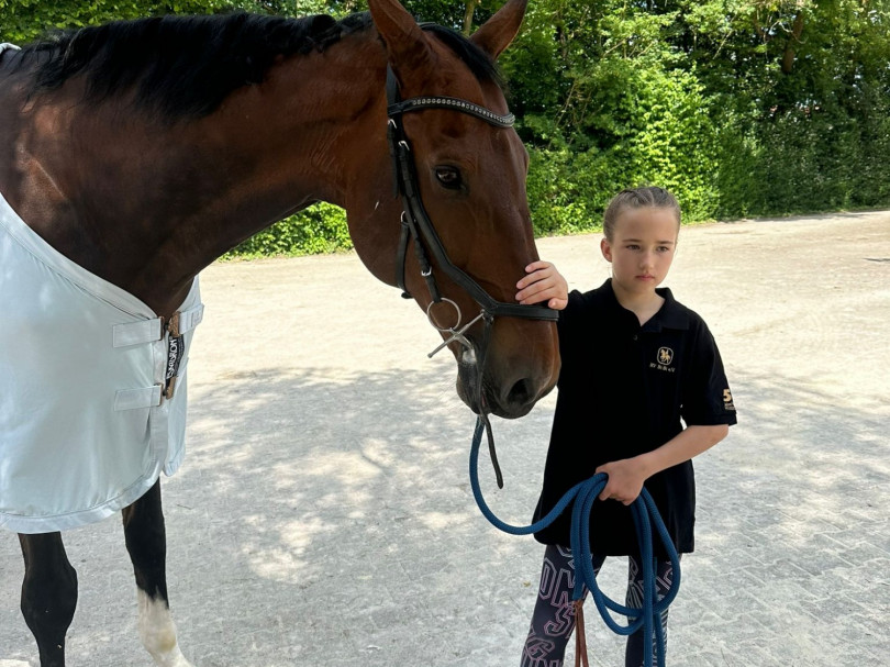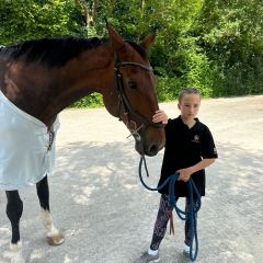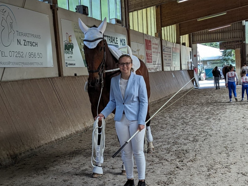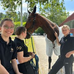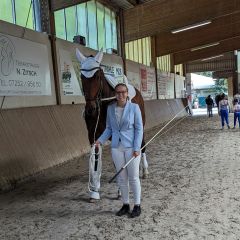Nach ca. 45 Minuten waren dann beide Pferde verladen und wir konnten losfahren. In Zaisenhausen angekommen haben wir erstmal die Pferde ausgeladen und haben Hagrid, nachdem wir nochmal gründlich drüber geputzt haben, bereit gemacht. Dann hieß es für das A-Team auch schon aufwärmen und Anzüge anziehen. Hilfe haben wir von Lisa bekommen, die uns großartig unterstützt hat. Im Anschluss einer passablen Pflichtrunde mussten wir uns etwas beeilen, da fast im Anschluss unser Kürstart war. Nach einer sehr zufriedenstellenden Kür, ohne Stürze, allerdings mit ein paar Wacklern, haben wir uns für die Siegerehrung umgezogen. Wir haben uns mit einer Endnote von 5,4 den ersten Platz geholt. Danach haben wir Hagrid noch eine kleine Pause im Schatten gegönnt, bevor er auf einen Paddock durfte. Währenddessen hat sich das M-Team für ihren Start vorbereitet. Comic wurde aus der Box geholt - die uns vom Reit- und Fahrverein Zaisenhausen zur Verfügung gestellt wurde - geputzt und angezogen. Nach einer anständig geturnten Pflicht ging es auch schon bald weiter mit der Kür. Auch das Team 1 von Bietigheim holte sich bei der zweiten Siegerehrung eine goldene Schleife. Beide Pferde haben noch ein kleines Geschenk bekommen, Möhren und eine Bürste.