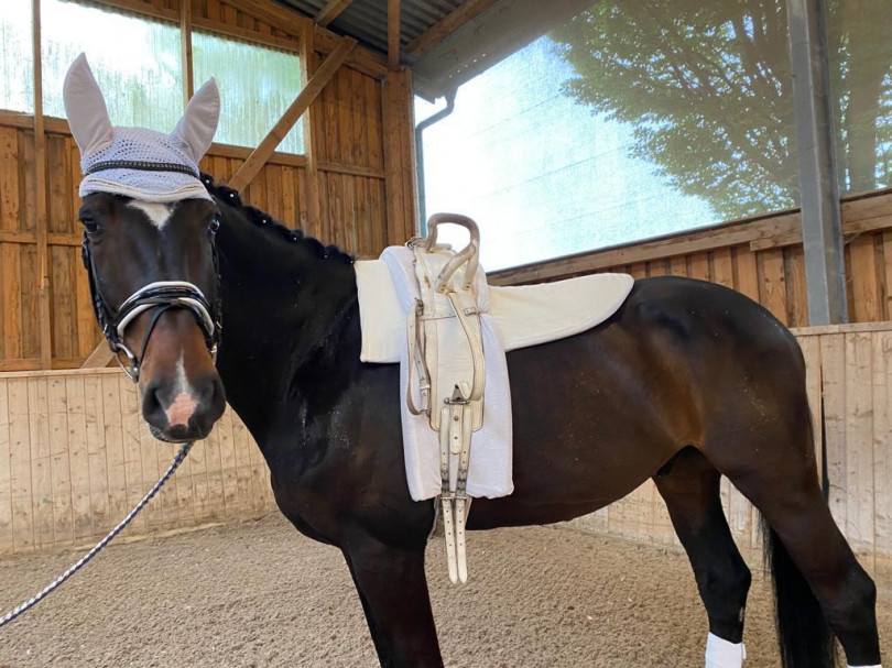 Romeo steht seit November 2012 bei uns im Stall. Schon beim ersten Mal ausprobieren hat er das Voltigieren ziemlich gelassen gesehen. 2013 hat er schon ein Turnier im Einzel bestritten und über den Winter haben wir ihn langsam auf eine Gruppenkür vorbereitet. 2014 ist er schon seine ersten Gruppenstarts gegangen und bis 2015 auch weiterhin für die Einzel und hat mit ihnen bereits seine erste Meisterschaft, die Landesmeisterschaften in Böblingen, erlebt. Mittlerweile läuft er hauptsächlich für das L-Team, aber auch für die Fördergruppe muss er ab und zu herhalten. Seit Ende 2018 ist Romeo nur noch als Ersatzpferd da. 2018 überbrückte er den Einsatz von Nobody in der Fördergruppe. Seit Anfang 2019 sollte er nur noch als Ersatzpferd eingesetzt werden. Doch nach dem ersten Trunier der L Mannschafft mit Carneol verletzte dieser sich so, dass er für den Voltigiersport nicht mehr geeignet ist. Und schon war er wieder mit dem L-Team auf Turniere gefahren. Dennoch soll langfristig ein Ersatz für ihn kommen. Außerdem läuft er zusätzlich auch noch für die Fördergruppe, da auch Nobody für die Voltigierer nicht mehr einsatzfähig ist. Seitdem Comic für die L Mannschaft läuft, kann er sich nun noch ein Stück mehr aus dem Voltigiersport zurückziehen.
