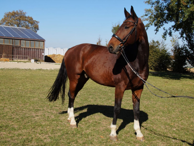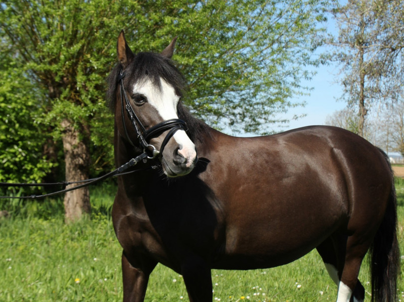 Farbe: schwarz, vier weiße Beine und eine ausdrucksvolle Blesse machen sie zum Hingucker
