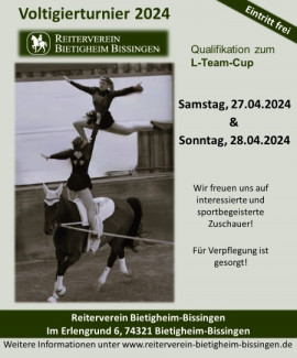 Am 27. & 28. April richten wir unser 7. Voltigierturnier aus. Damit haben auch die Akrobaten unter den Pferdesportlern die Möglichkeit, sich auf unserer Anlage zu präsentieren. Ein besonderes Highlight ist die Qualifikation für den L-Team-Cup die wiederholt der Bietigheimer Reiterverein austragen darf. Momentan sind wir aber noch in der Planung. Bald finden Sie hier auch schon die Ausschreibung und später auch die Zeiteinteilung. Wir freuen uns schon jetzt auf ein schönes Turnierwochenende, mit allen LPO Prüfungen am Samstag und den Prüfungen aus dem WBO Bereich am Sonntag.