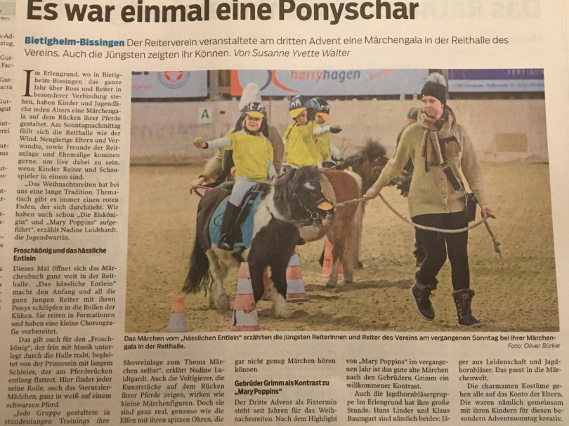 Im 50igsten Jahr des Vereins hatten sich die Kinder- und Jugendabteilung ein besonderes Sahnestück zur Weihnachtsaufführung ausgesucht. Nach der traditionellen Eröffnung durch die Jagdhornbläser führten rund 80 Mitglieder und viele Pferde die Verfilumg des erfolgreichen Disneyklassiker „Eiskönigin“ vor.