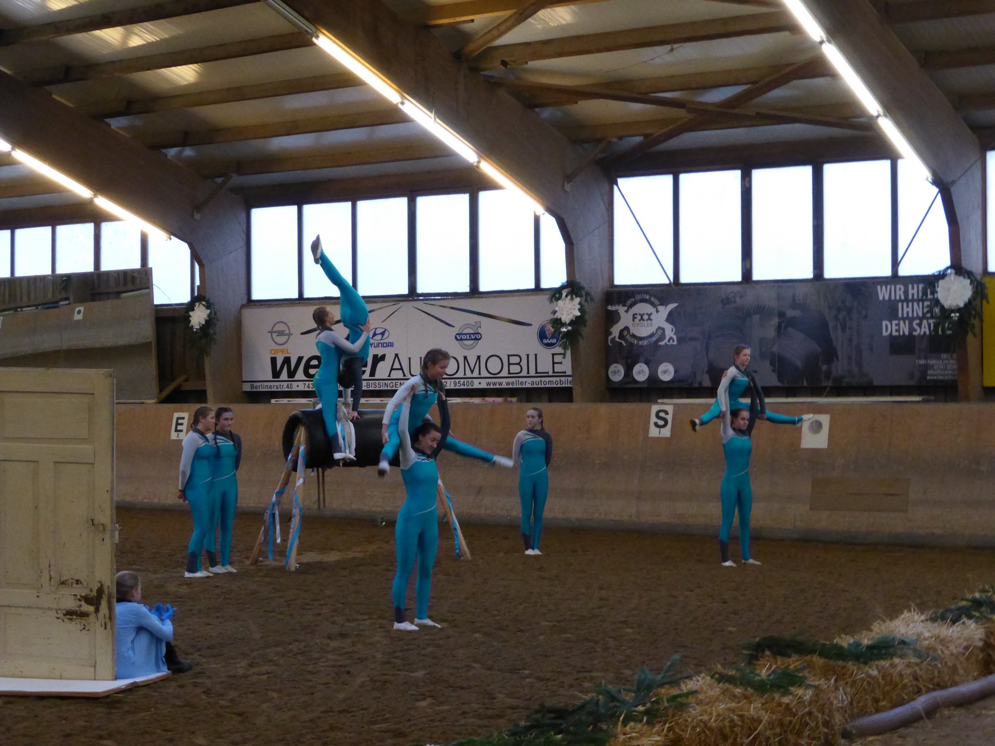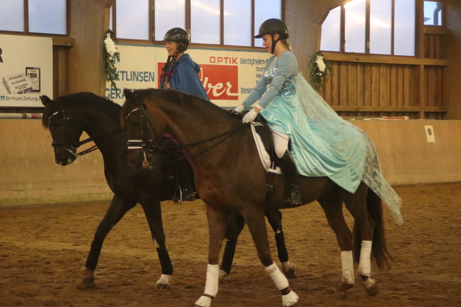 Vorab wurde von den vielen aktiven Vereinmitgliedern Dekorationen gebastelt, Kostüme geschneidert und jede Menge Probestunden geleistet. Die Kinder vom eigenen Ponyclub zeigten eine Ponyquadrille in tollen „Schneemann-Olaf“ Kostümen, die Voltegierer bezauberten mit einer Kür und viele andere Schauspieler, Reiter und natürlich die Pferde stellten wundervolle Szenen dar.