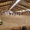 In der Mittagspause mussten sich nun auch die Nachwuchs- und Fördergruppe auf ihren allerersten Start vorbereiten. Die Nervosität der Kleinen wuchs mit Näherrücken ihrer Startzeit. Ebenso wie am Vortag, war auch an diesem Nachmittag die Reithalle gut besucht. Den Anfang nach der Mittagspause machte die Nachwuchsgruppe mit ihrer Kostümkür zu "die Schule der magischen Tiere". Jedes Kind war als ein Tier verkleidet und auch Chiara und Julia traten als Tierfängerin und Lehrerin auf. Sogar Tarina bekam etwas Schmuck in Mähne und Schweif. Direkt danach durfte die Fördergruppe den Galopp-Schritt Wettbewerb eröffnen. Sie zeigten ihre Pflicht im Galopp auf Romeo und ihre Kür im Schritt. Es verlief alles ohne große Patzer. Die vier Trainerinnen, die mit den Kleinen in den Zirkel gingen, können echt stolz auf ihre Voltis sein und haben nun auch ihr erstes Turnier als Trainerinnen hinter sich. Danach ging es schon wieder für das M-Team los. Sie zeigten noch, in Konkurrenz zu drei anderen Teams, ihre Harry Potter Kür auf dem Turnpferd. Auch mit dieser Leistung waren sie sehr zufrieden. Nun stand die letzte Siegerehrung des Turniers auf dem Programm. Die Nachwuchsgruppe erreichte den 1. Platz mit einer Wertnote von 5,590. Die Fördergruppe erhielt eine weiße Schleife für den 3. Platz mit einer Wertnote von 4,229, ebenso wie das M-Team für ihre Kür mit einer 7,4. Nach der Siegerehrung musste die Reithalle wieder leergeräumt werden. Danach konnten wir noch den Mittag und das Turnier in Sonnenschein auf der Anlage ausklingen lassen.