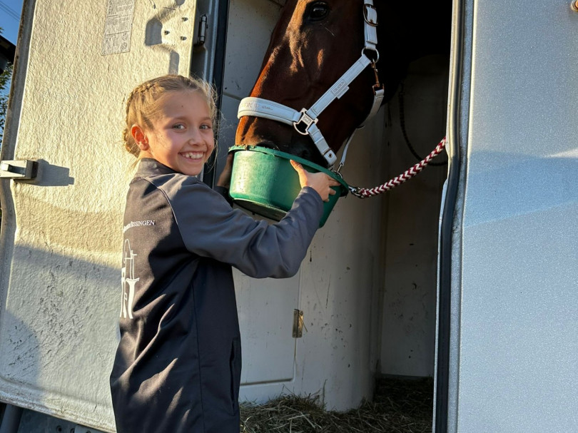 Am nächsten Tag, um kurz vor 10, haben sich die beiden Teams im Stall getroffen, um die Frisuren noch fertig zu machen und unsere zwei besten Pferde für die Fahrt vorzubereiten.